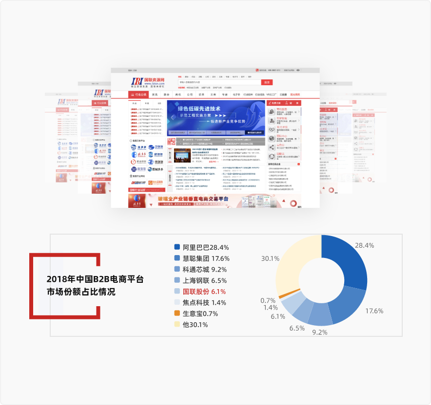 北京國聯視訊信息技術股份有限公司(股票簡稱:國聯股份,股票代碼:603613.SH),領先的B2B電子商務和產業互聯網平臺。公司以工業電子商務為基礎,以互聯網大數據為支撐,為相關行業提供工業品和原材料的網上商品交易、商業信息服務和數字技術服務。公司致力于互聯網、物聯網、大數據、云計算、人工智能等新技術與傳統產業的深度融合,實現促進傳統產業降本增效的價值使命。 B2B信息服務平臺——國聯資源網(www.ibicn.com),為各行業企業提供商業信息服務,已歷經十余年的發展,業務覆蓋100余個工業行業領域,擁有318萬+注冊會員企業,1000萬黃頁數據庫,1.5億招投標信息資源。在冶金、煤炭、電力、機械、醫藥、化工等方面擁有豐富的行業資源。 B2B垂直電商平臺——涂多多(www.toodudu.com)、衛多多(www.wdoodoo.com)、玻多多(www.boododo.com)、紙多多(www.zdoodoo.com)、肥多多(www.feidoodoo.com)、糧油多多(www.lydodo.com)、芯多多(www.xdoodoo.com)、醫械多多(www.yidoodoo.com)、冷鏈多多(www.lldoodoo.com)、新能多多(www.nedoodoo.com),為涂料化工、衛生用品、玻璃、造紙、化肥、糧油、芯片、醫藥器械、冷鏈、新能源等產業上下游提供網上商品交易業務...